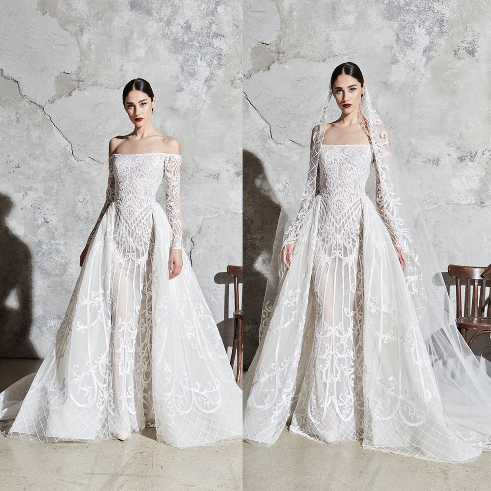 Sexy Zuhair Murad Mermaid Wedding Dresses With Detachable Train Off Shoulder Long Sleeve Lace Wedding Gown Sweep Train Robe De Mariee From Kuaileju 156 34 Dhgate Com